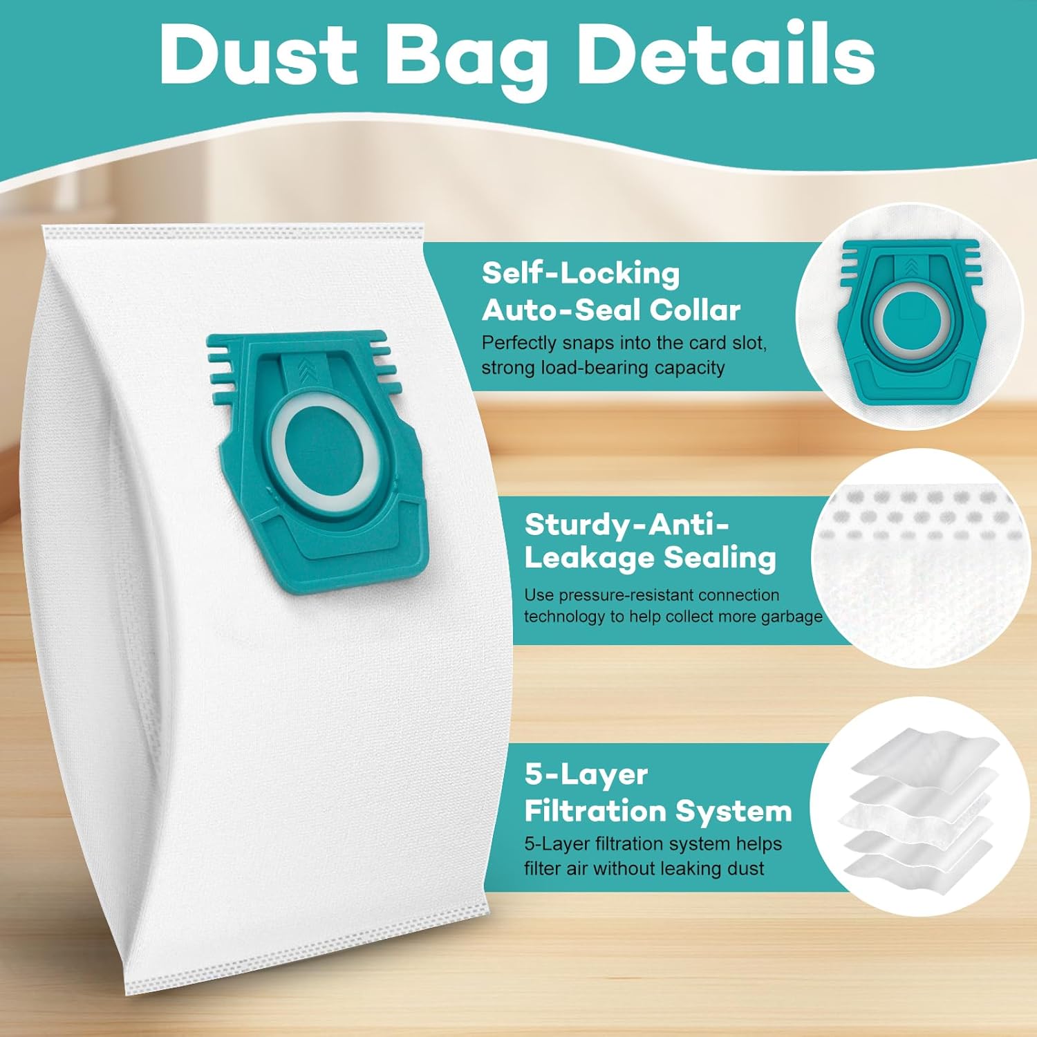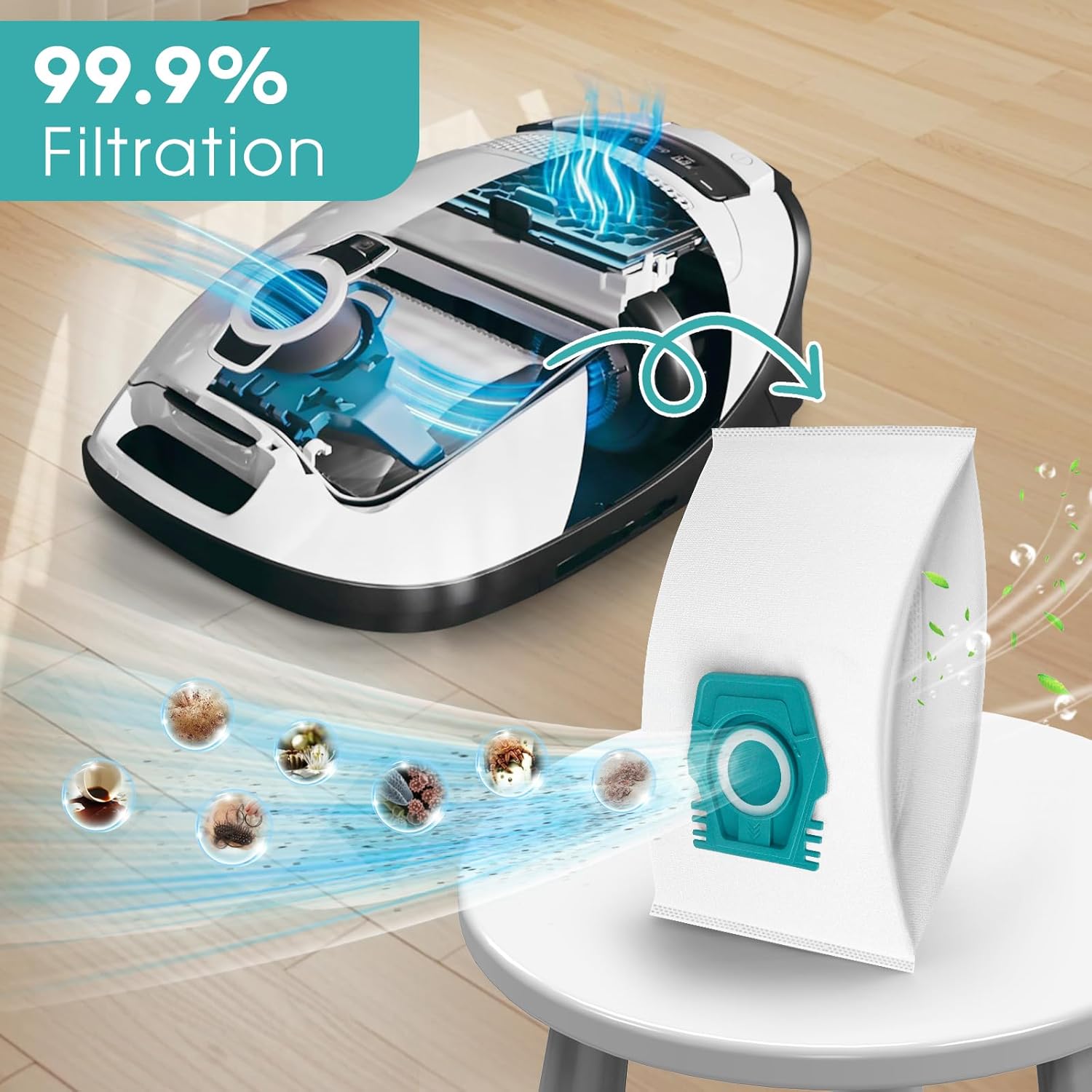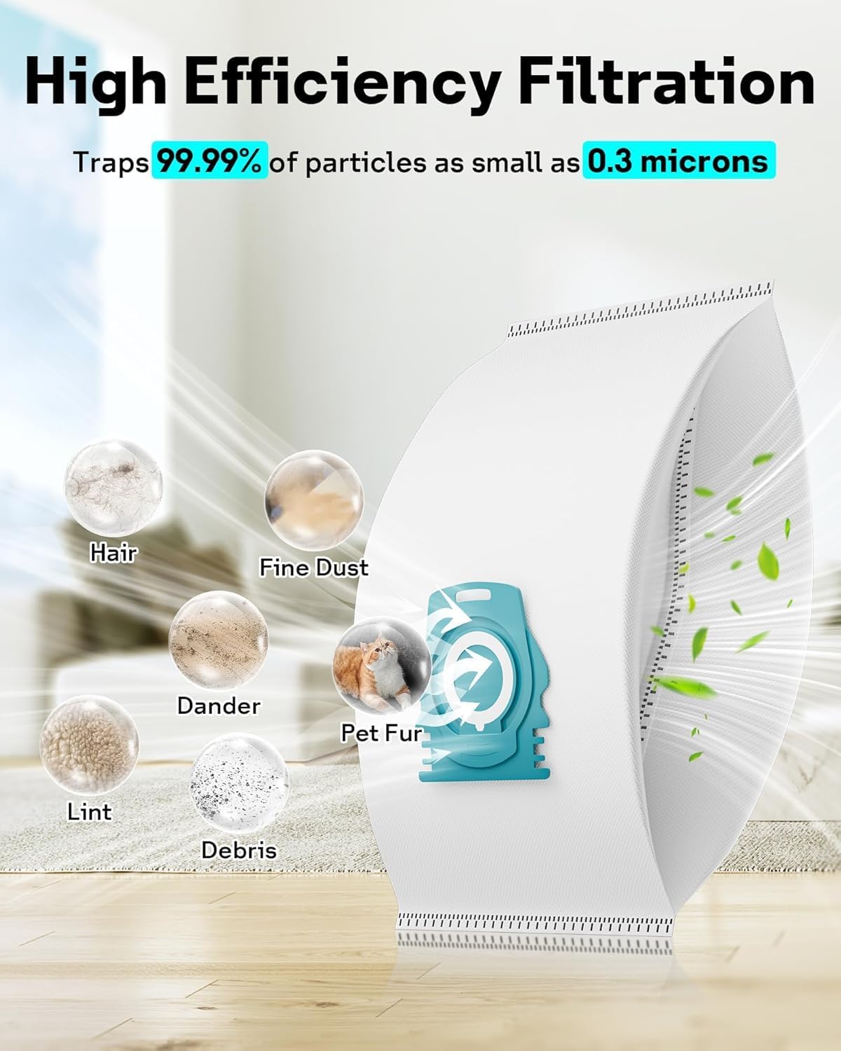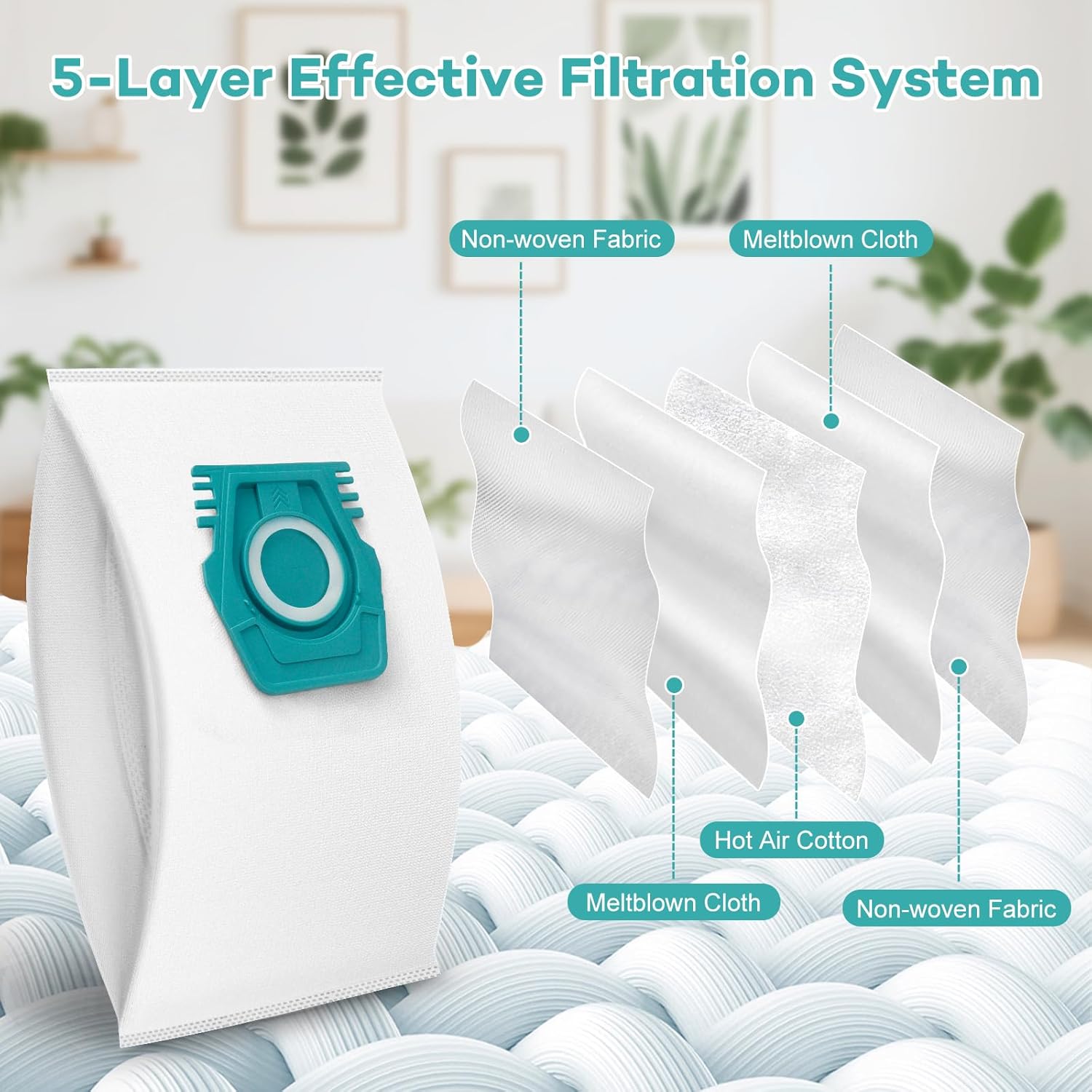 Our vacuum hoover bags are made of a 2-layer superfine melt-blown fiber filter, 1-layer hot air cotton non-woven fabric and 2-layer precise non-woven fabric that effectively blocks over 99.9% dust 0.3-micron particles and other debris.